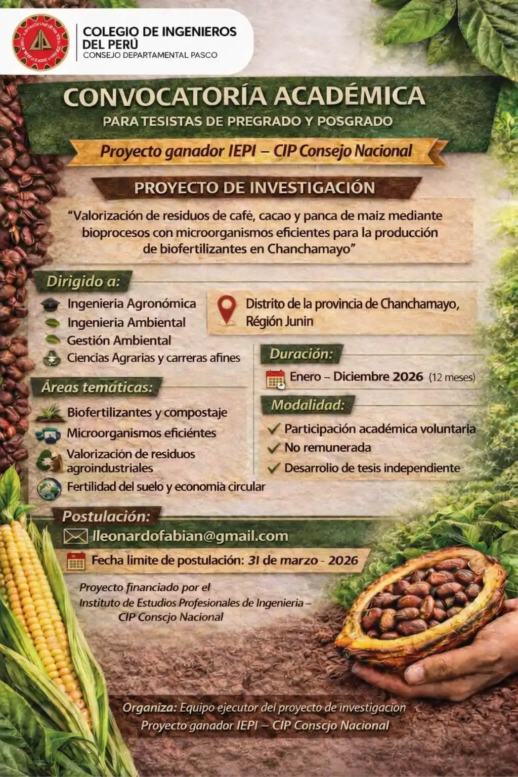 El Colegio de Ingenieros del Perú – Consejo Departamental Pasco invita a ingenieros y bachilleres a participar como tesistas de pregrado y posgrado en el Proyecto de Investigación ganador IEPI – CIP Consejo Nacional, denominado “Valorización de residuos de café, cacao y panca de maíz mediante bioprocesos con microorganismos eficientes para la producción de biofertilizantes en Chanchamayo”.
