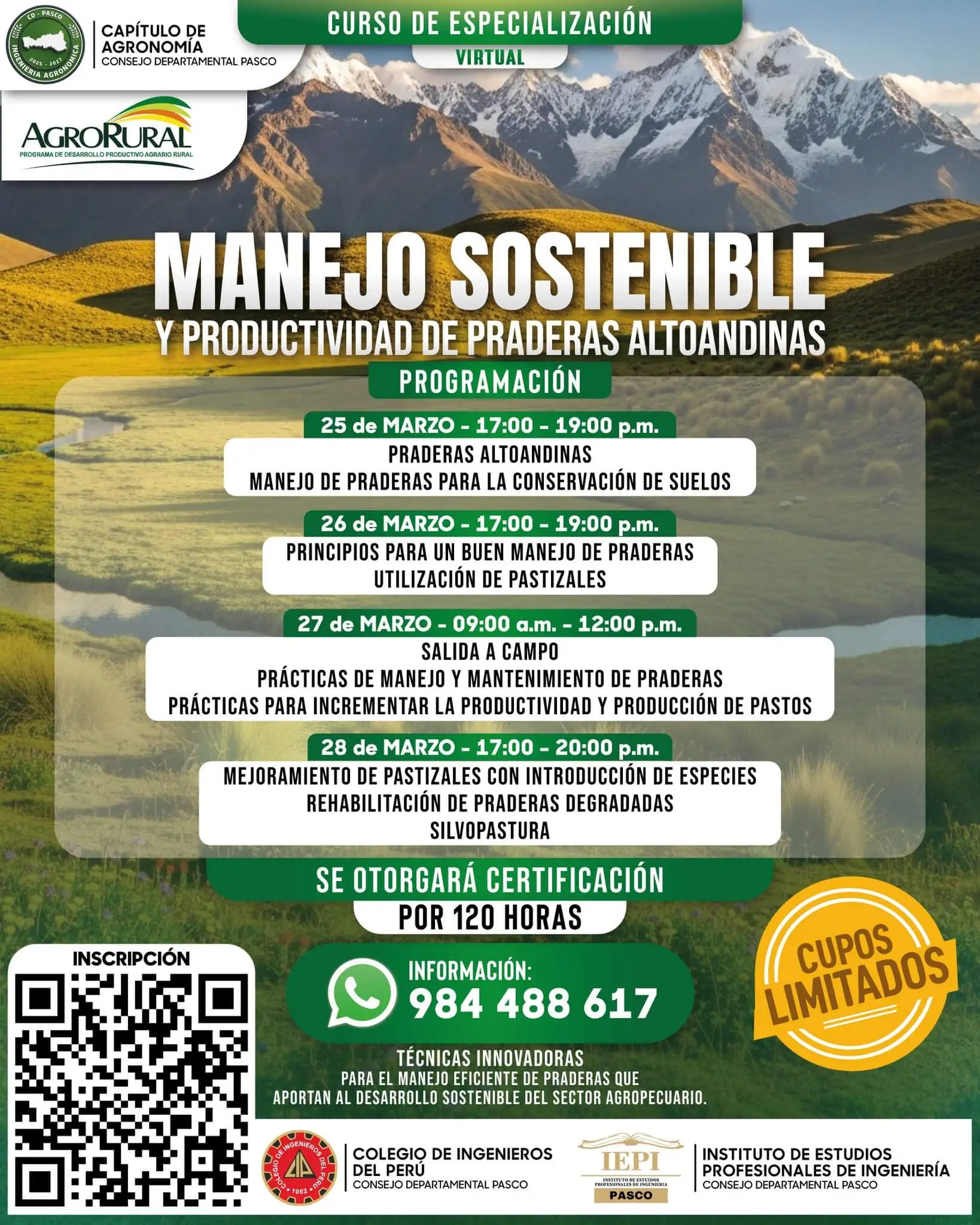 El Colegio de Ingenieros del Perú – Consejo Departamental Pasco, en coordinación con el Instituto de Estudios Profesionales de Ingeniería (IEPI) y en el marco del convenio con el programa AgroRural, presenta el Curso de Especialización en Manejo Sostenible y Productividad de Praderas Altoandinas.