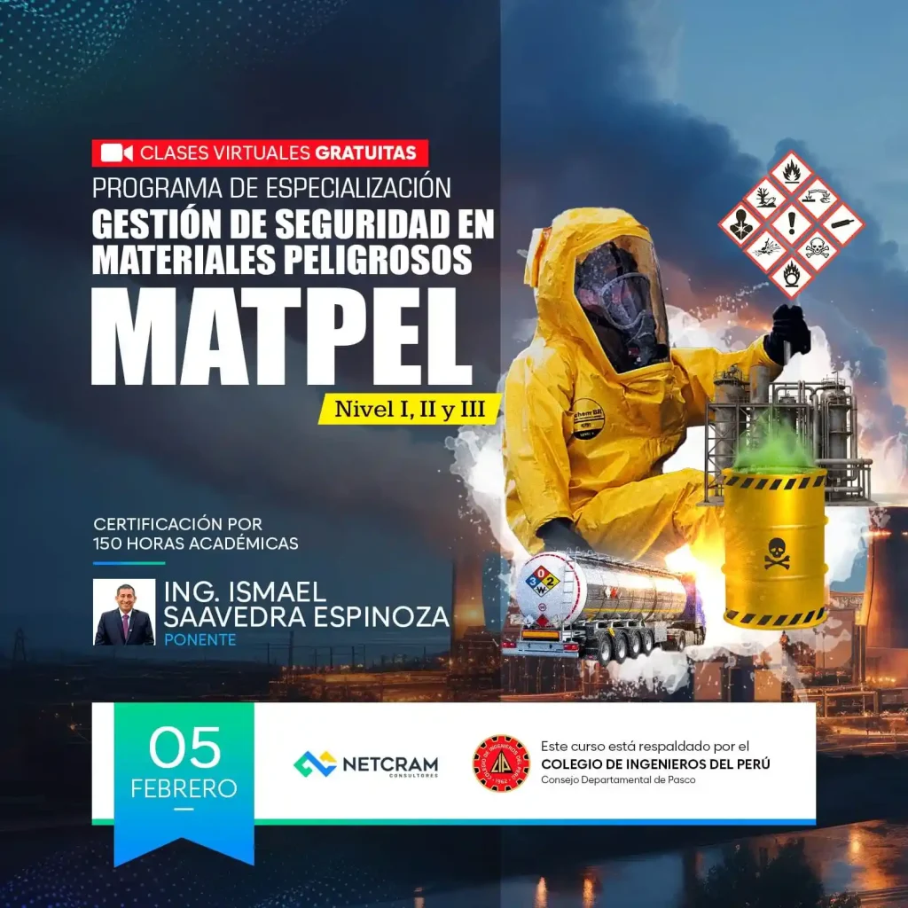 El Colegio de Ingenieros del Perú – Consejo Departamental Pasco presenta el Programa de Especialización – Gestión de Seguridad en Materiales Peligrosos (MATPEL), una propuesta académica orientada a fortalecer las competencias técnicas y normativas de los profesionales frente al manejo, transporte, almacenamiento y control de materiales peligrosos.